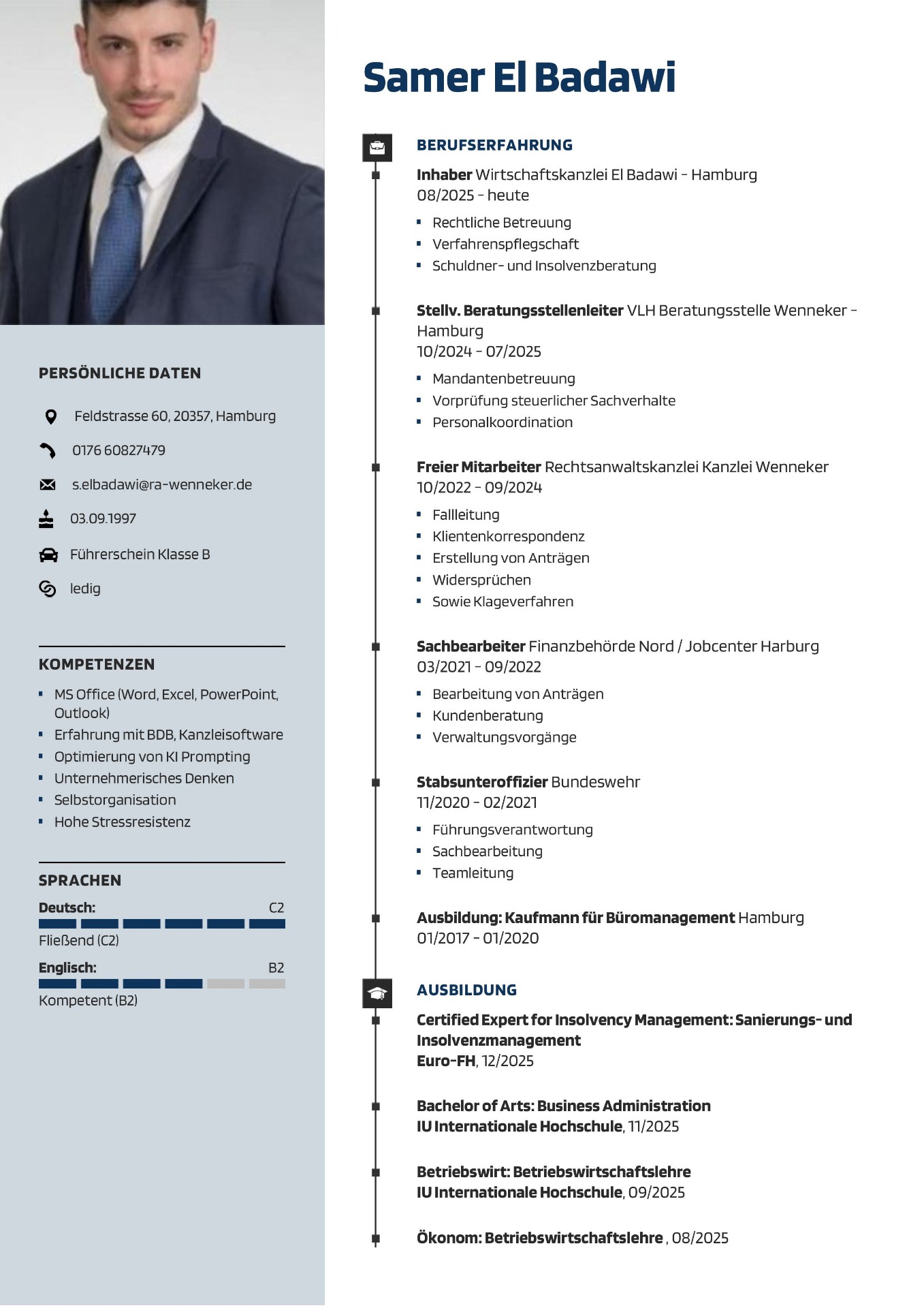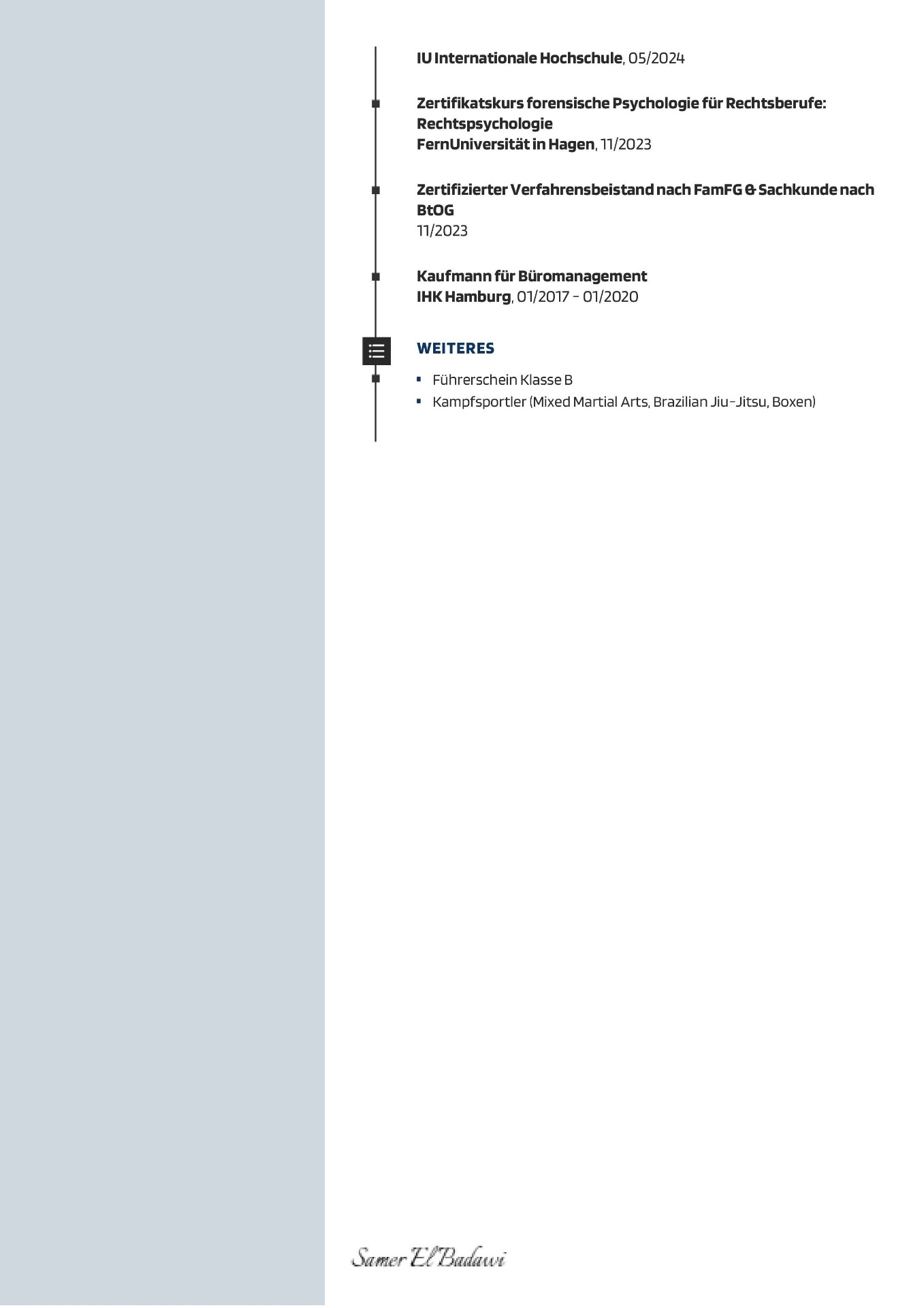 Neben den offensichtlichen Qualifikationen aus Ausbildung und Studium, verfügt Herrn El Badawi über juristische Zertifizierungen in den genannten Bereichen, z.B. im Insolvenzrecht an der Euro-FH, der Zertfizierung als Verfahrensbeistand gem. § 158 Abs. FamFG, oder dem Zusatzabschluss der Weiterbildung "forensische Psychologie für Rechtsberufe" an der staatl. FernUni Hagen, und der Sachkunde als rechtlicher Betreuer nach Betreuerorganisationsgesetz.